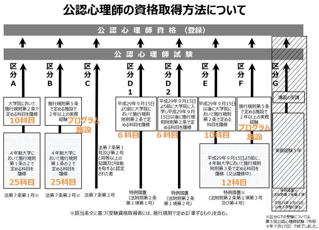 一般財団法人公認心理師試験研修センターHPに示されています以下の受験資格取得ルートにおいて、特例措置にあたる「受験資格区分D1・D2・E・F」に該当する2017年度以前に本学へ入学された方を対象に、個別に科目読み替え表(PDF)を送付しています。