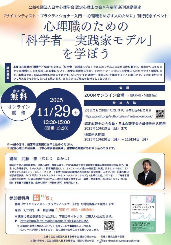 TOPICS 認定心理士の会×有斐閣 新刊連動講座『サイエンティスト・プラクティショナー─心理職をめざす人のために』刊行記念イベント 心理職のための「科学者―実践家モデル」を学ぼう